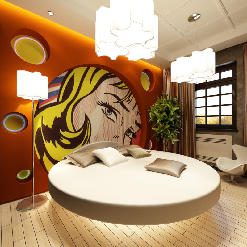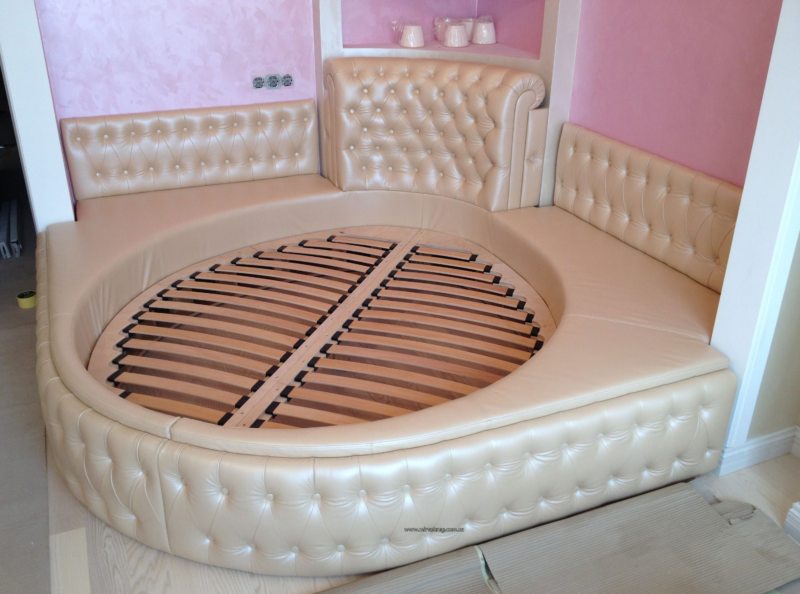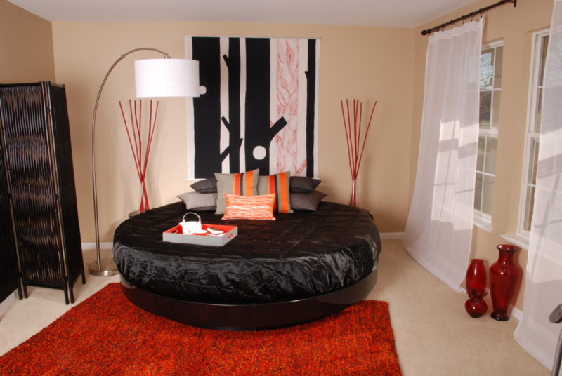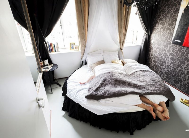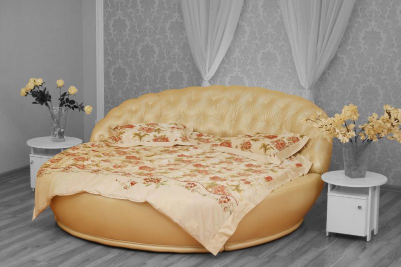 В просторных помещениях можно с помощью круглой кровати создать неповторимую атмосферу покоя и роскоши, можно добавить балдахин к интерьеру. Необходим матрац и постельное белье круглой формы, которое должно органично вписаться в образ комнаты.