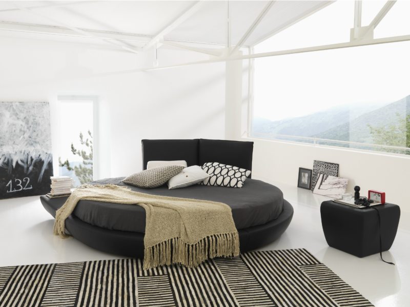 Контрастным акцентом предлагают черное круглое покрывало, где пол также черного цвета. Потолок и стены белые или очень светлых тонов (молочный, жемчужный), на полу пушистый кремовый ковер. Минимум мебели и жалюзи дополнят простой и элегантный интерьер.