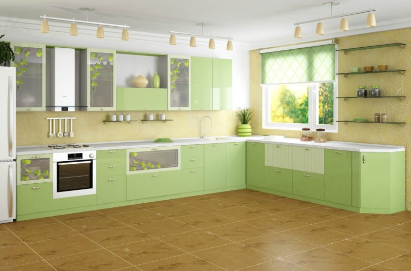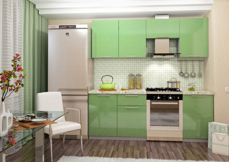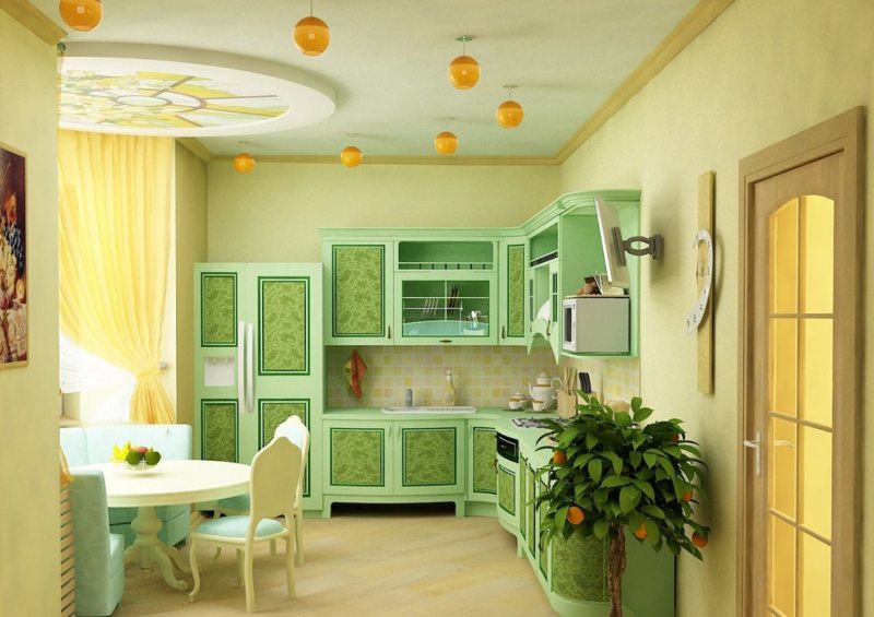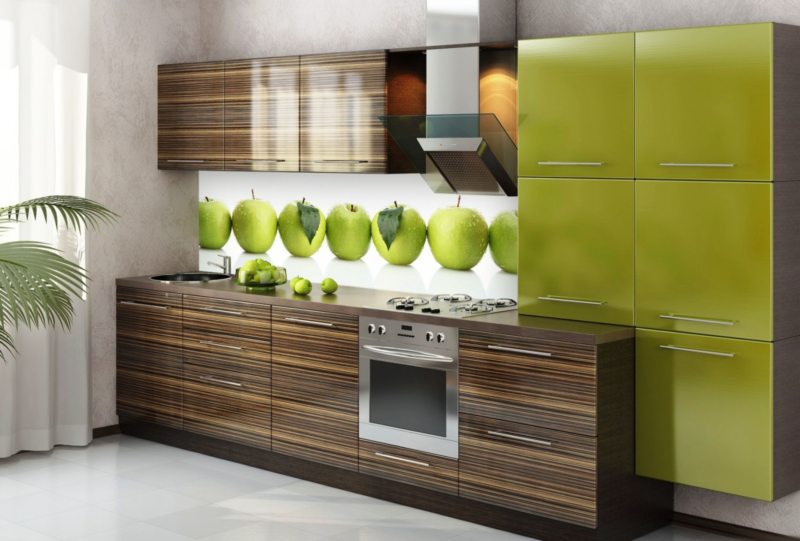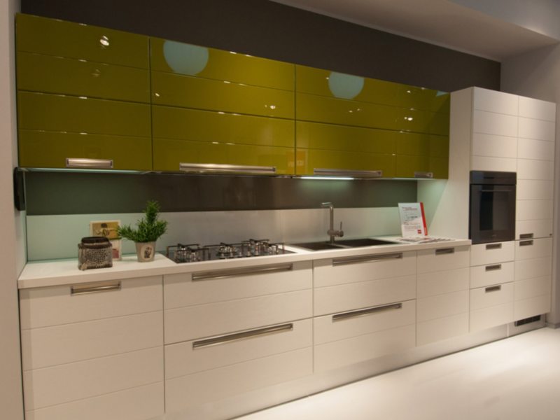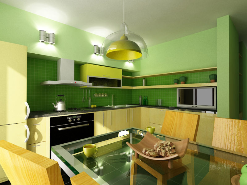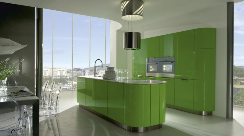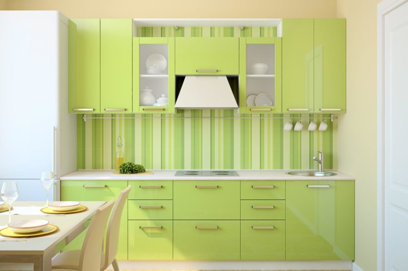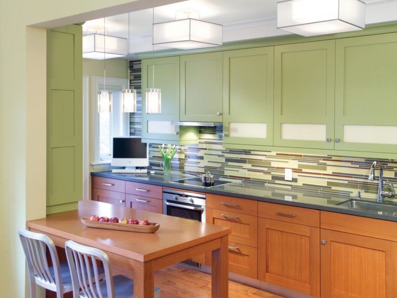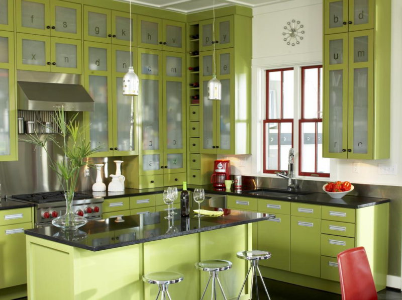 - Желто-зеленый фасад – отличное решение, запросто воплотимое в реальность, потому как такие фасады выполняют с дерева, пластика, МДФ.