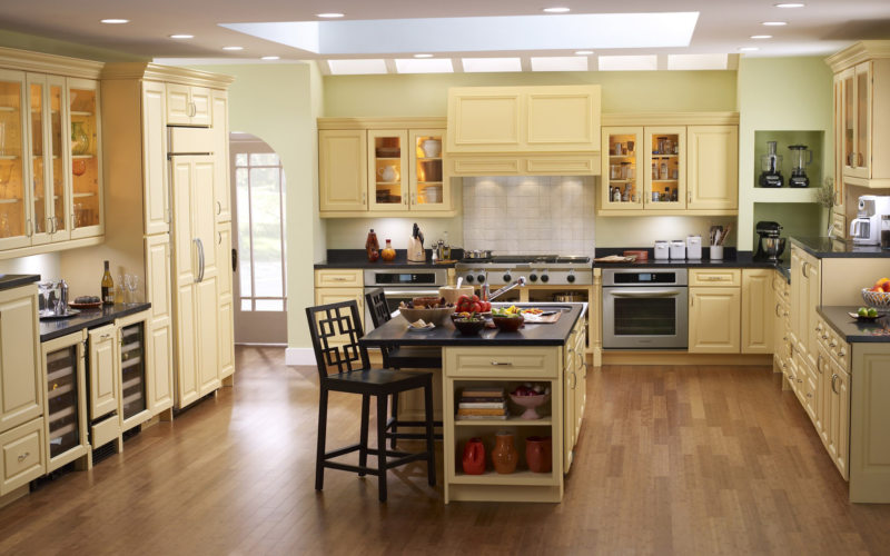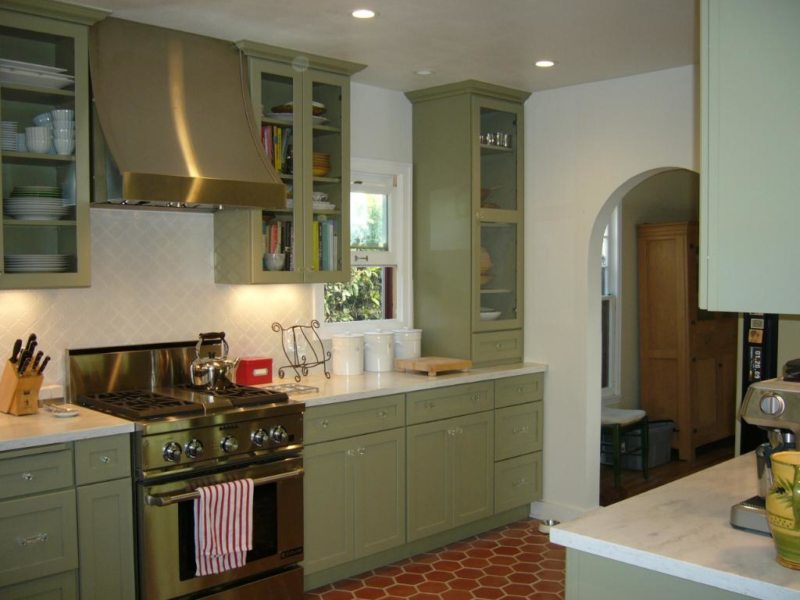 Неповторимые кухни, выполненные в оливковом цвете. Отдельные интерьеры обогащаются мебелью приятного зеленого цвета, иные обоями и плиткой данного оттенка.