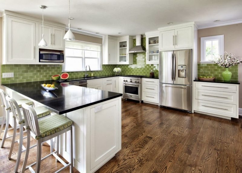 Столешницы с глянцем и матовый пол – игра контрастов. Безопасность и контрастность служат нам – шероховатость пола защищает от скольжения, глянец легок в уборке.