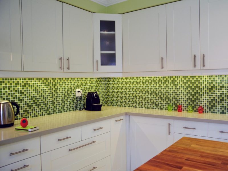 Яркий фартук может быть усилен аксессуарами, например, вазами, цветами. Фартук в один тон будет выглядеть более динамично, если размещена плитка будет ромбами.