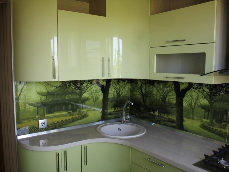 Для пленки лучше всего подходят фасады без ручек. Такая стильная кухня в оливковых тонах, на фото это отчетливо видно, прекрасно смотрится со столешницами, что выполнены из стекла, мрамора.