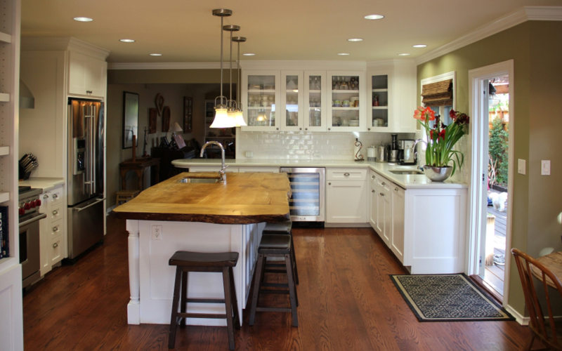 Уютнее будет казаться кухня, если будут использованы светлые акварельные тона. Такие тона используют в провансе, классике и кантри.