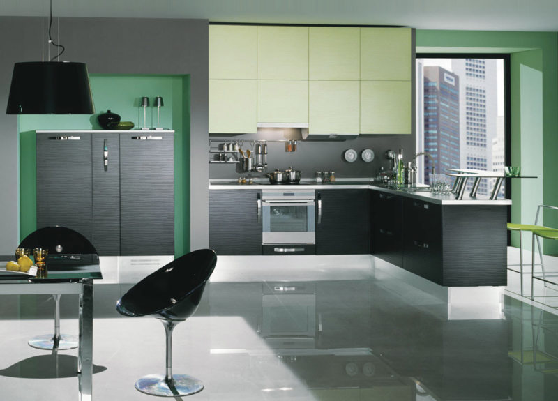 Современный дизайн кухни в оливковом цвете значительно выигрывает именно в сочетании с серым.