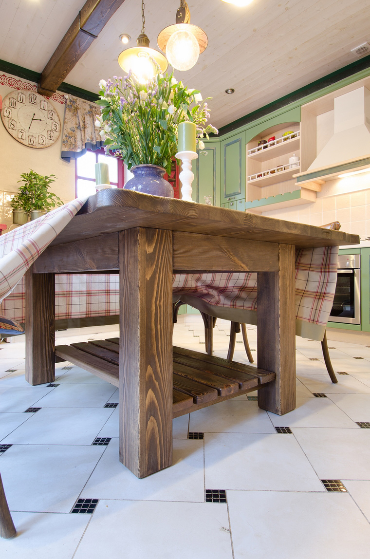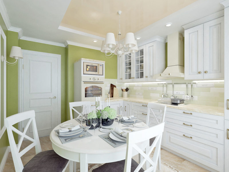В обязательном порядке салатовый фон повторяется в мелких деталях на кухне. Это может быть салатовый абажур на лампе, салатовый орнамент скатерти, неброский салатовый рисунок на шторах.