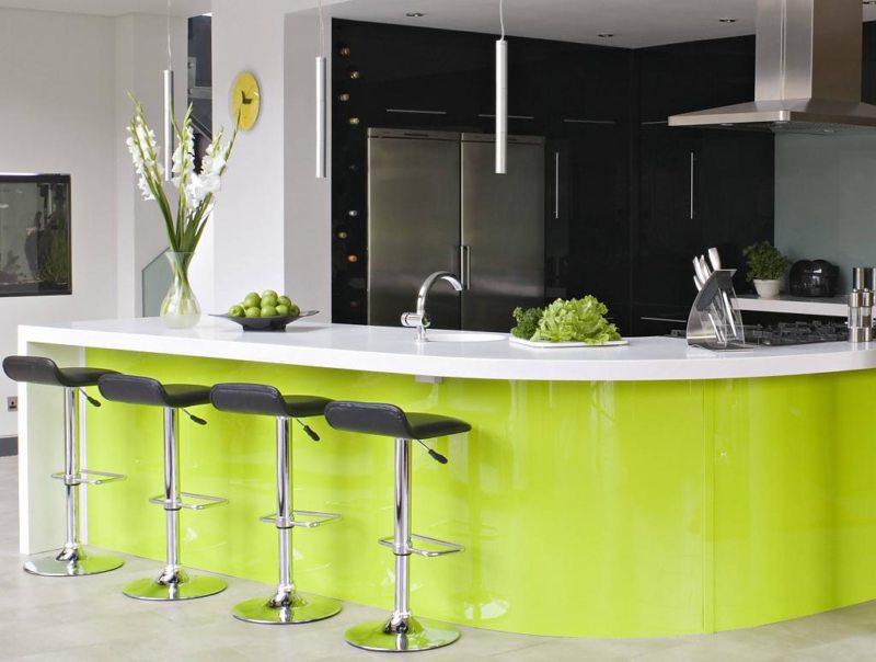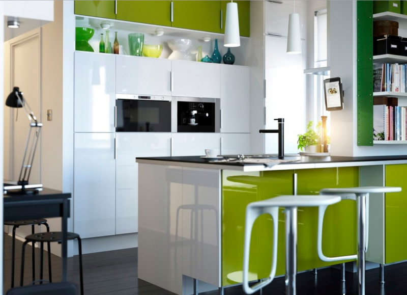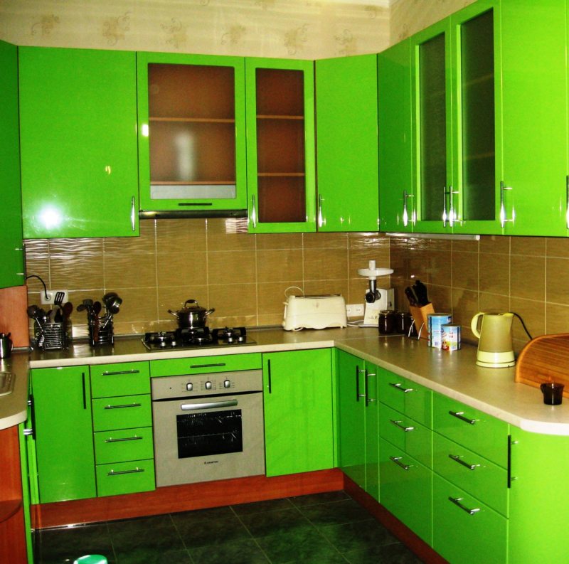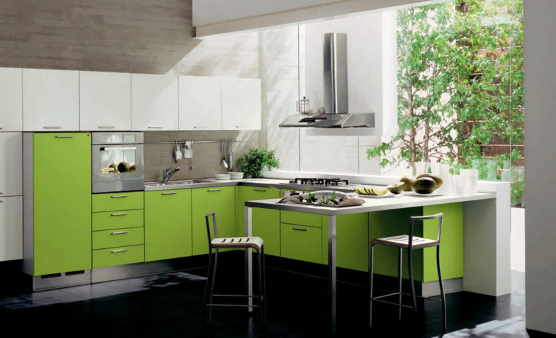 Если мебель на кухне выделяется своей яркостью и броскостью, то цвет стен должен носить приглушенный и сдержанный фон. И наоборот. При невыполнении этого несложного правила дизайна кухни в салатовом цвете, в кухне будет присутствовать атмосфера балагана и карнавала, что очень быстро утомит и будет раздражать хозяев.