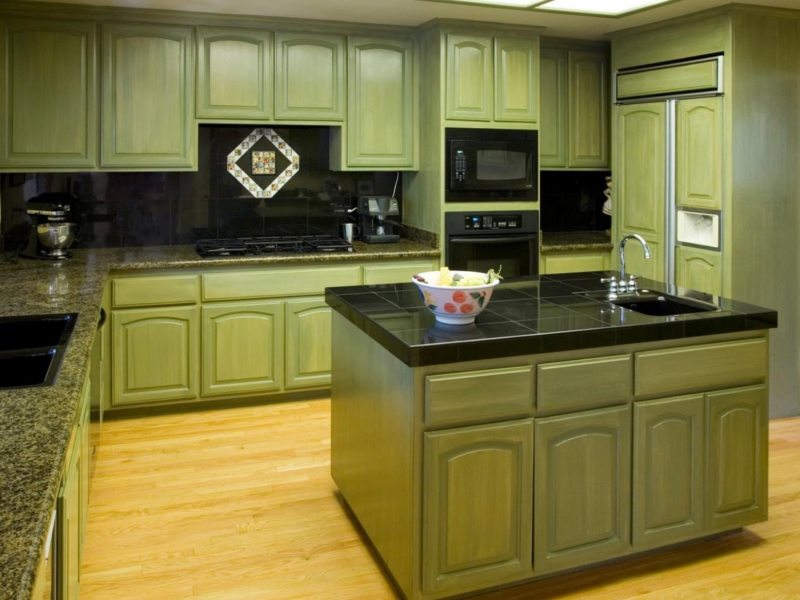 Стильность и элегантности приобретает салатовая кухня в сочетании с близкими по гамме расцветками, например, с цветом оливок.