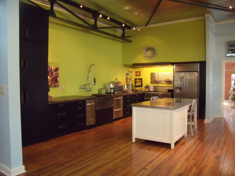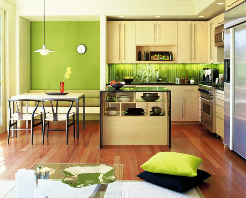 Салатовые стены великолепно сочетаются с любой светлой или темной мебелью, разнообразными деревянными фасадами.