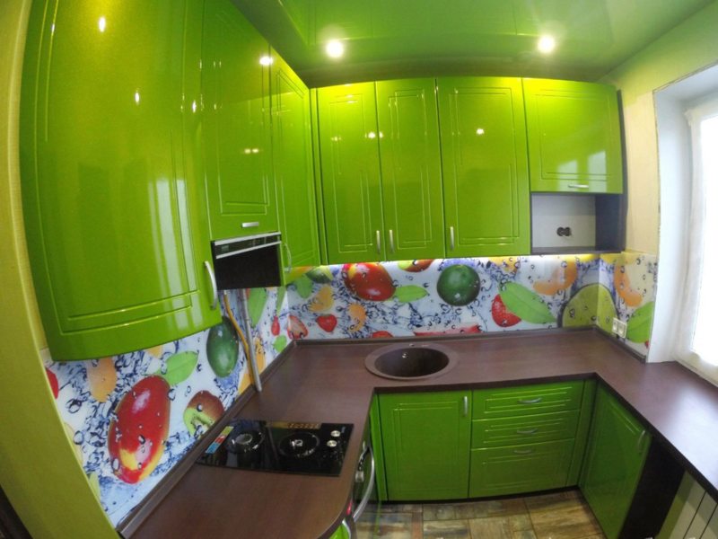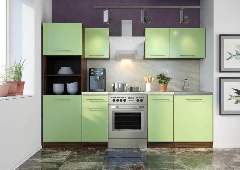 Самыми популярными фото кухни в салатовом цвете, считаются современные модели с фасадом цвета венге и коричневой глянцевой мебелью.