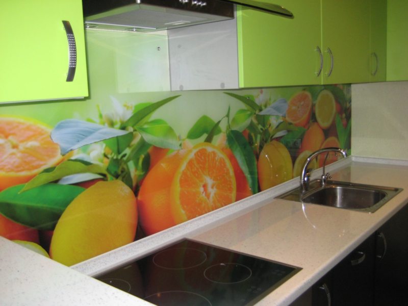 Салатовый фартук прекрасно будет гармонизировать со сливочным или цвета слоновой кости фасадом. При таком выборе на кухне должно присутствовать минимальный набор мебели, желательно из дубового шпона.