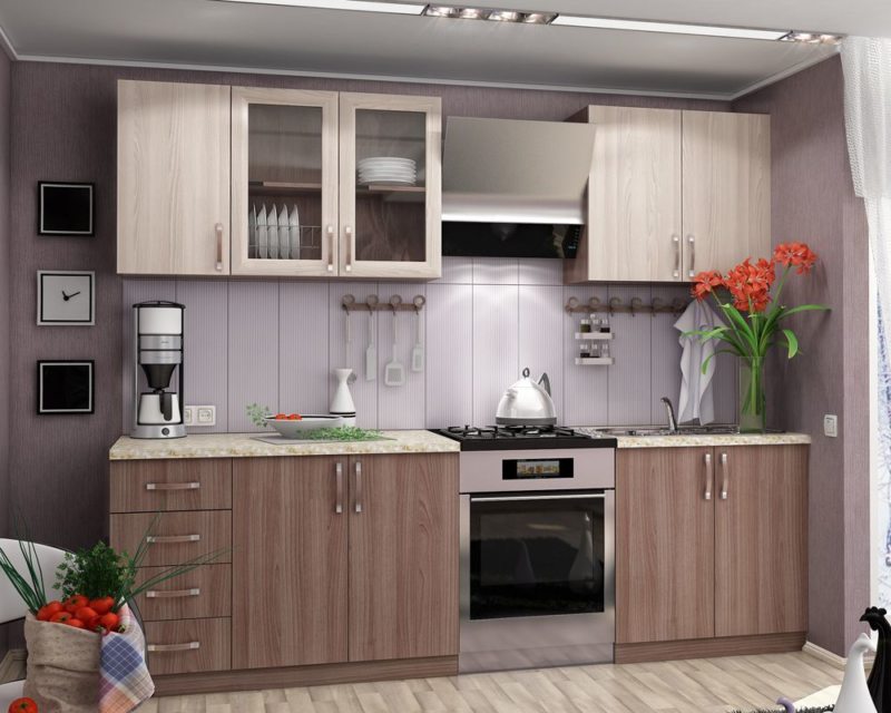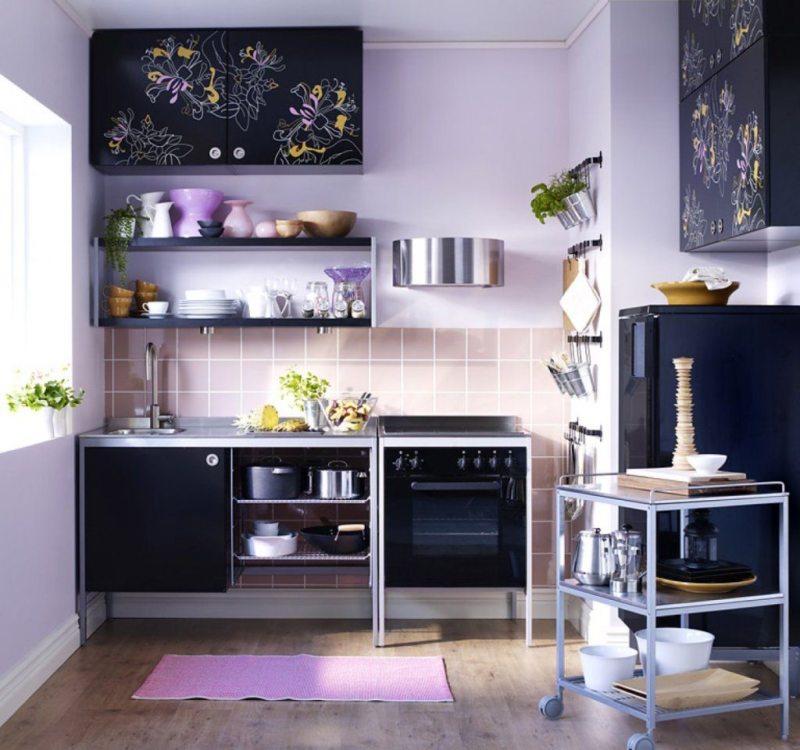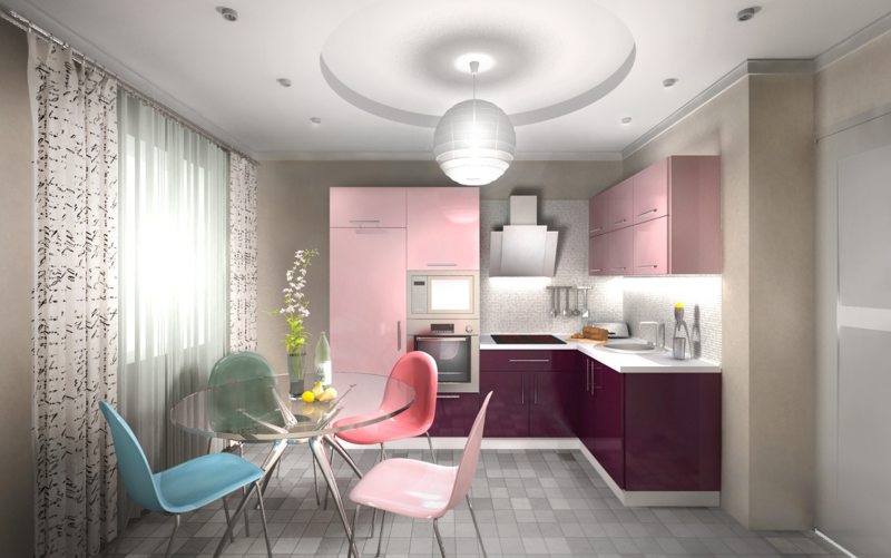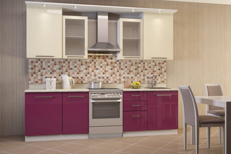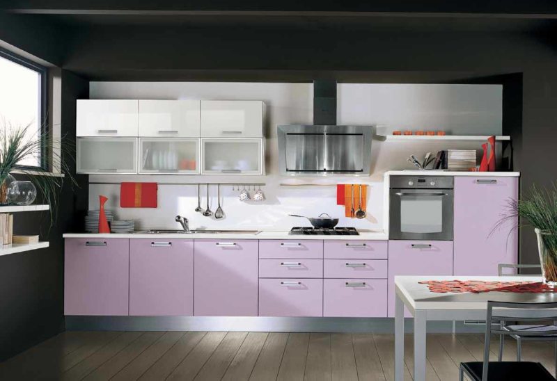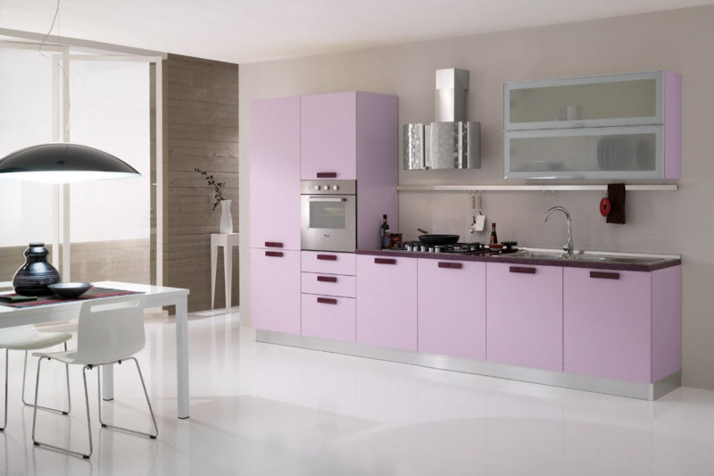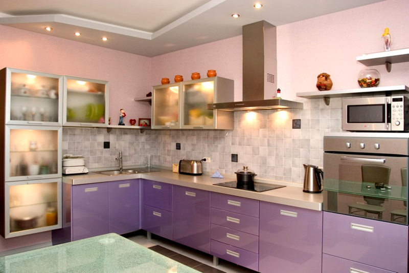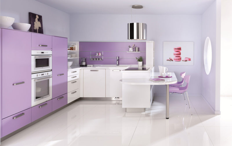 Кухня наполнится домашним уютом при комбинации сиреневого с бежевыми оттенками. Если вы романтичная душа, то сиреневый в сочетании с розовым будет прекрасной идеей.