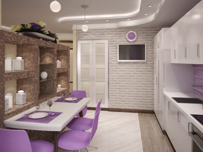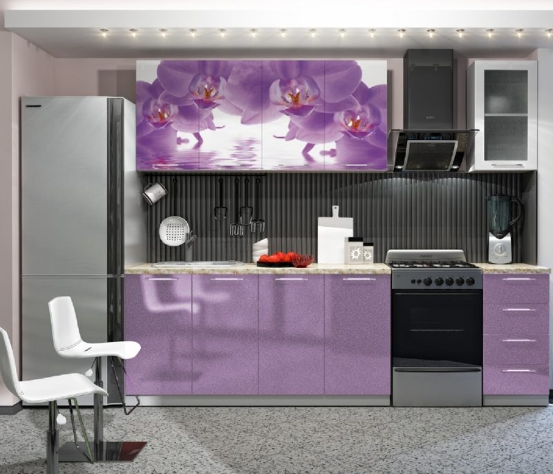 Сиреневая палитра в интерьере стильной кухни, в оформлении которой основной цвет сиреневый редко встречаются. Есть варианты с бледно сиреневым оттенком, но яркий цвет применяют редко. Ведь цвет этот для отважных жильцов.