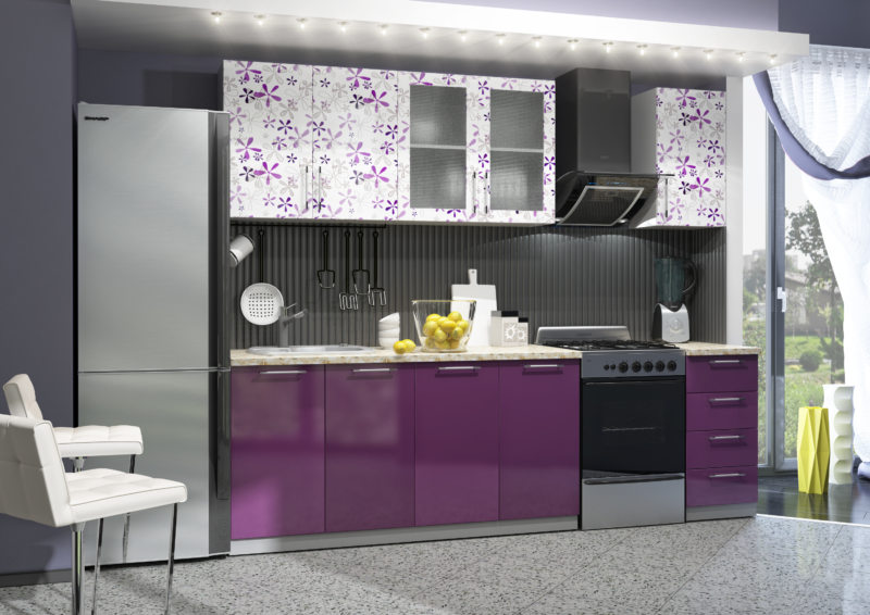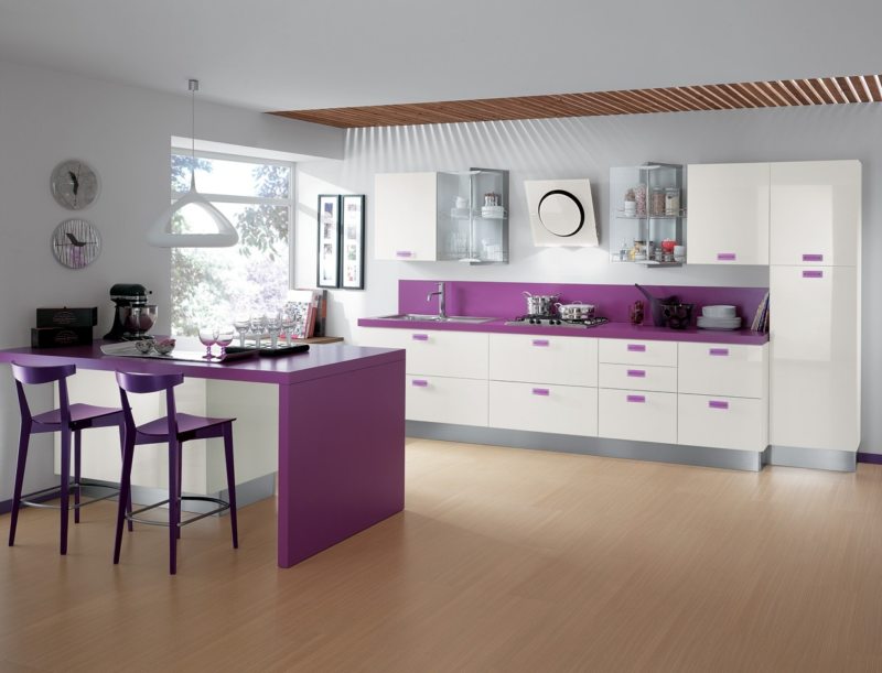 Для кухни фиолетового цвета подойдет столешница контрастных оттенков. Фартук должен сочетаться с гарнитуром или цветом кухни. Черно белый фартук идеально подойдет для любой кухни.