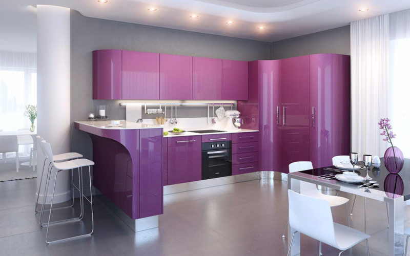 Комбинация сиреневого с красным наоборот вызывающая и энергичная. Будет эффектно и необычно смотреться интерьер кухни сиреневого цвета в сочетании с ярко черными и белыми цветами. Этот вариант для необычных людей, которым надоела классика и обыденность.