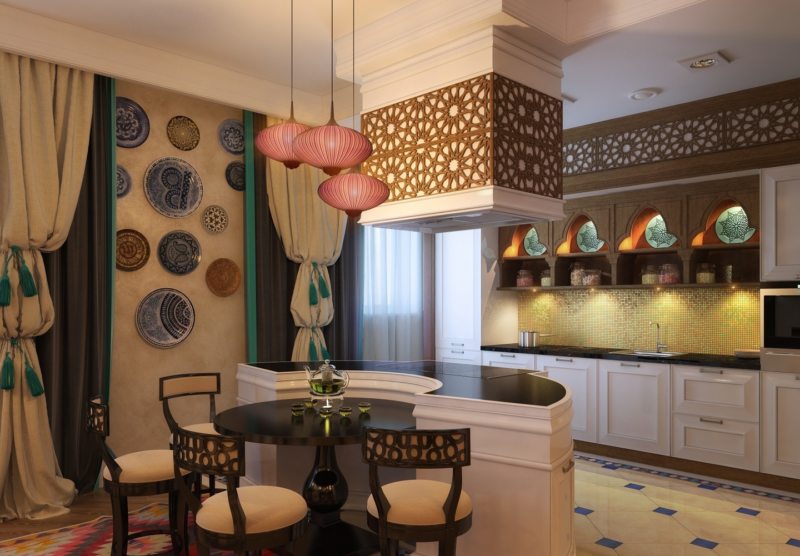 Свет в такой кухне должен быть ярким, и его должно быть очень много, но один момент — все светильники и люстры должны быть скрыты от глаз. Для того, чтобы подчеркнуть некоторые элемента декора, то необходимо поставить несколько абажур, они придадут более мягкий свет.