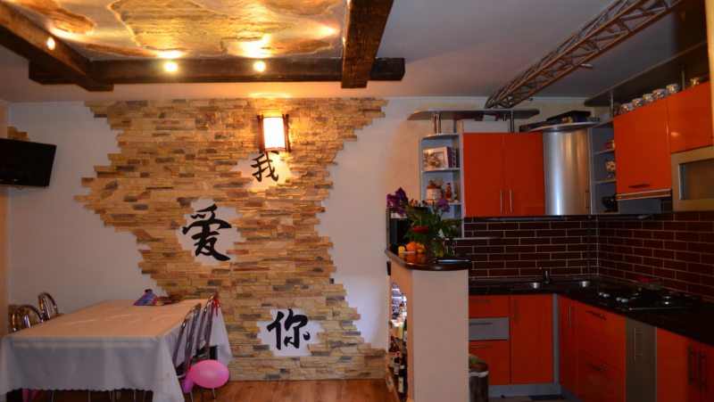 В качестве декораций отлично подходят аксессуары из натурального дерева. Если сравнивать дизайн кухни в китайском стиле с японским, то можно отметить тот факт, что дизайн несет философское жизненное отношение.