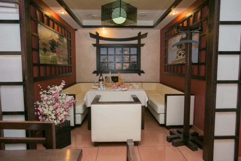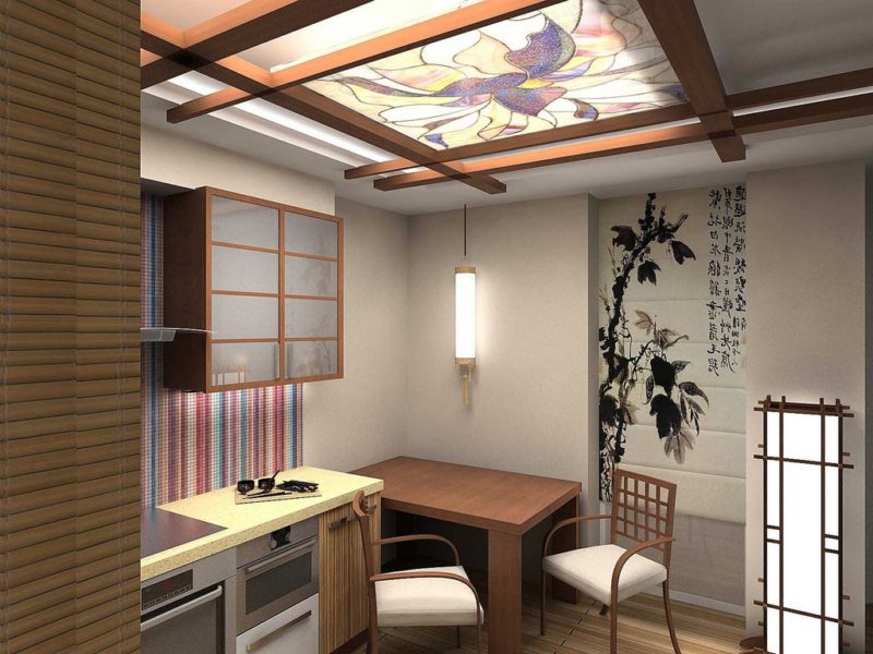 Потолок, желательно должен быть белого оттенка, с деревянными и стеклянными вставками, и не стоит забывать об освещении. Стены также могут быть обшиты шелком или панелями из дерева.