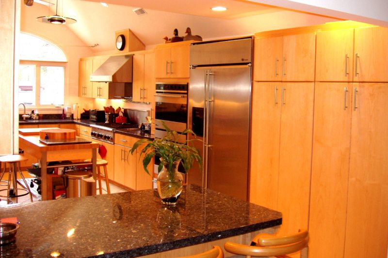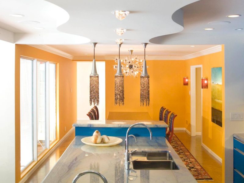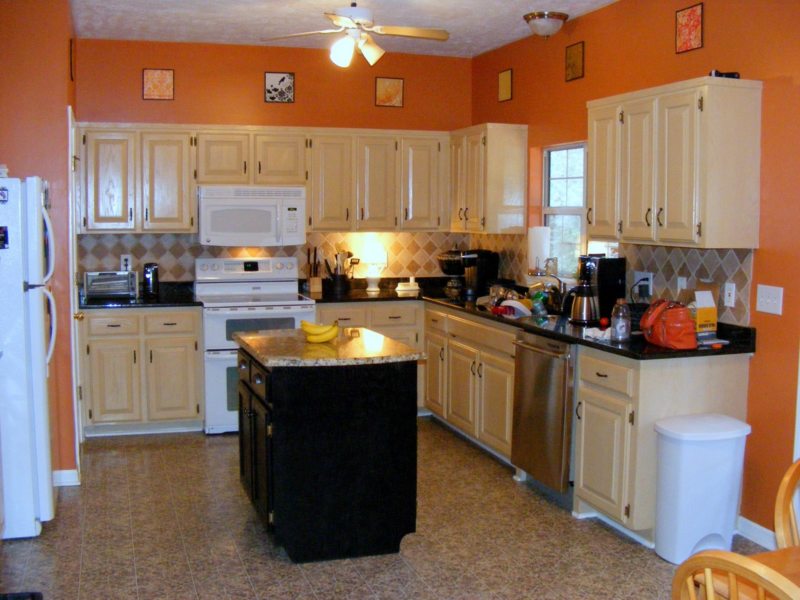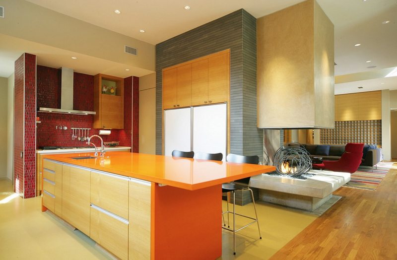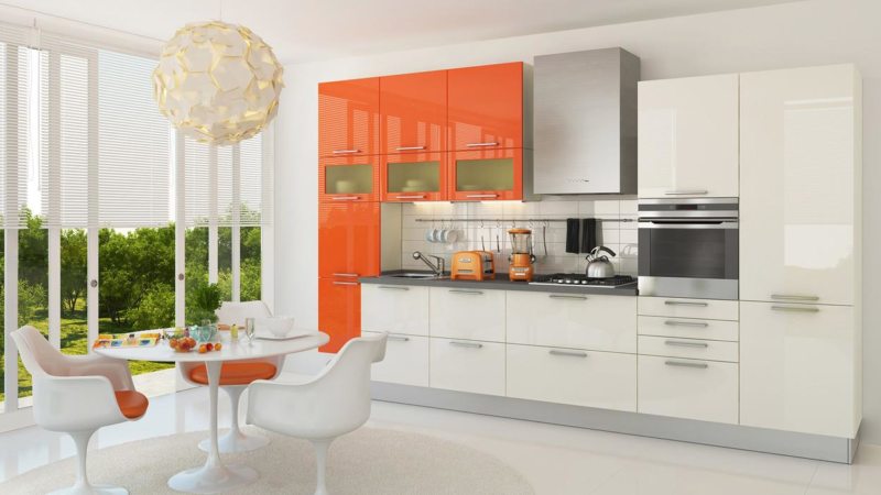 Сделав выбор в пользу кухни оранжевого цвета не значит, что присутствовать он должен во всем вокруг с потолка до пола.