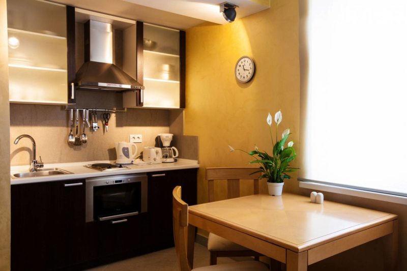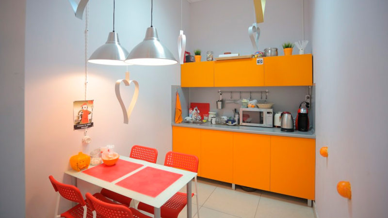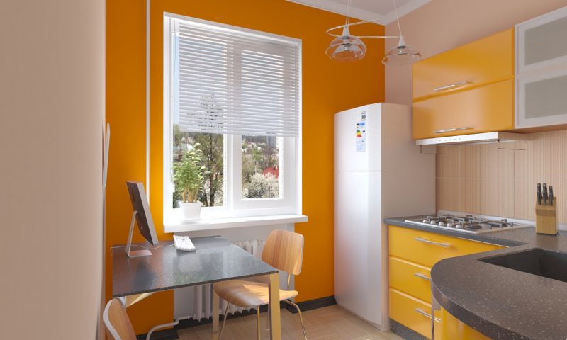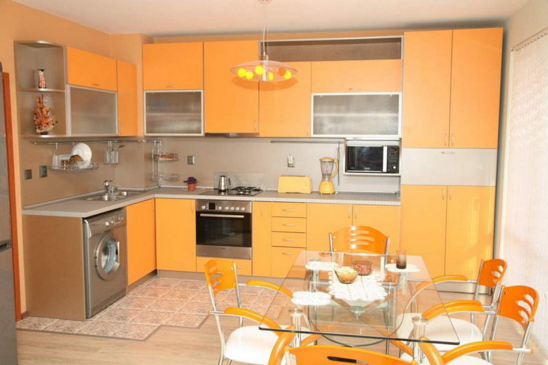 Оформив ярким только столешницу, текстиль, предметы быта получите легкий, но динамичный оранжевый интерьер кухни не перегруженный лишними красками. Это сочетание верный выбор для небольшой кухни.