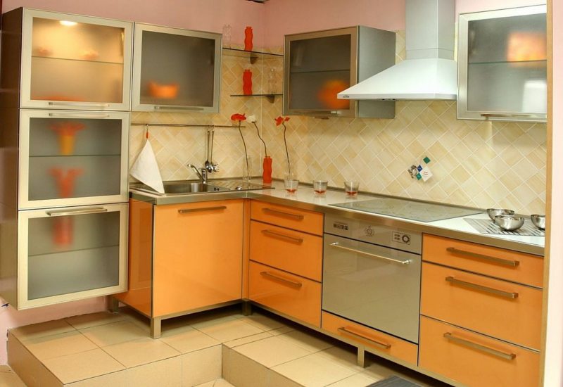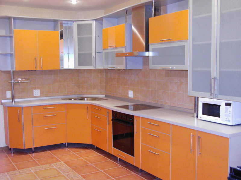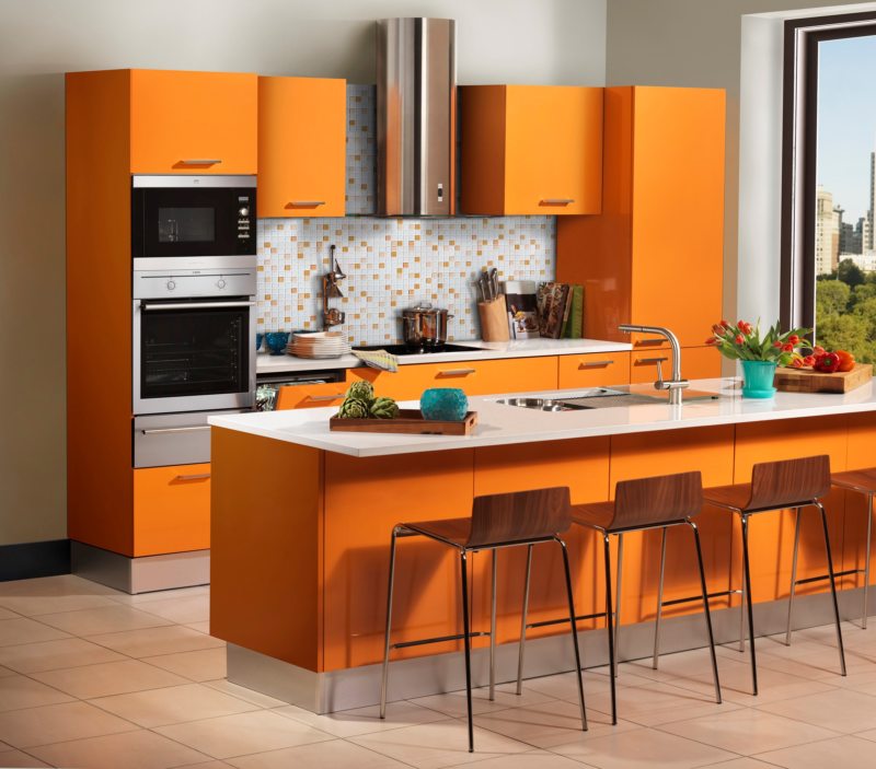 А можно наоборот выбрать вызывающие оранжевые стены и более спокойные детали. Отличным вариантом станет комбинирование цветов на фасадах шкафов.