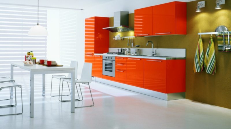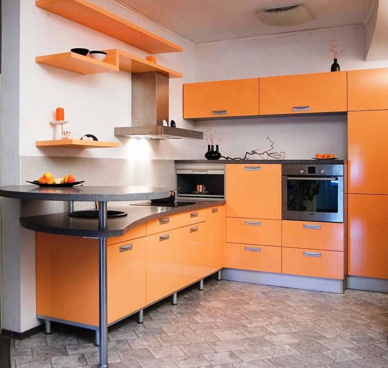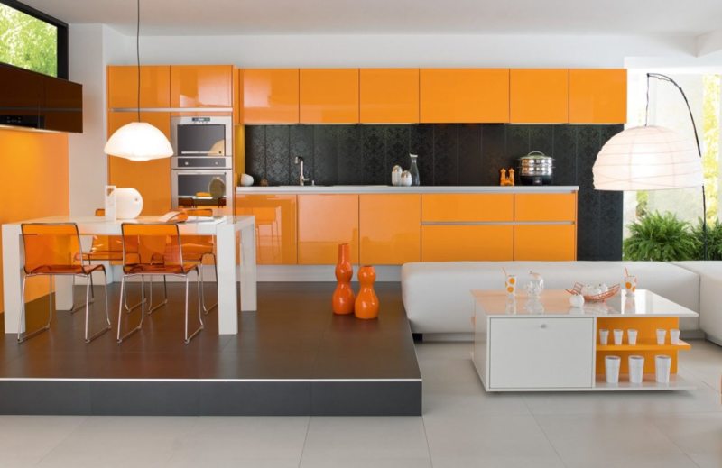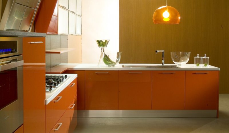 Кухня в оранжевом цвете подарит великолепное настроение, настроит на оптимизм, подтолкнет двигаться вперёд не обращая внимание на сложности, обеспечит слаженную работу пищеварительной и мочеполовой систем, пробудит аппетит, подзарядит позитивом, энергией движения.