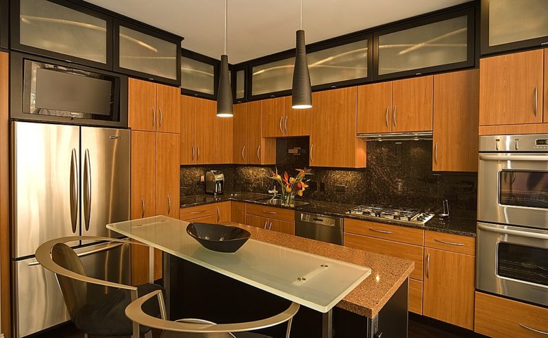 Наиболее выигрышные комбинации оранжевого в дизайне кухни — это сочетание с черным, белым, зелёным, серым. Кроме того, дизайнеры часто применяют насыщенно-тёплый синий и венге. Кухни в оранжевом цвете в примерах помогут определиться с выбором приемлемого сочетания.