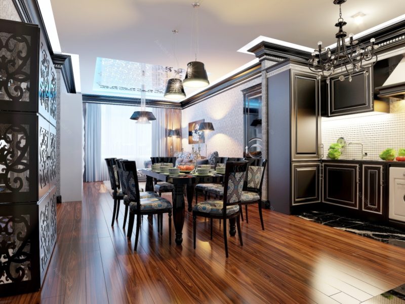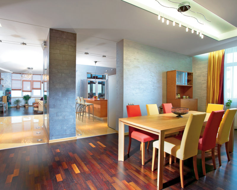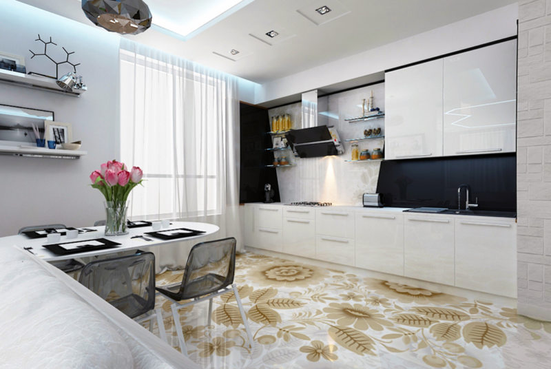 Стоит отметить, что для полноценного интерьера кухни в стиле фьюжн вам понадобится качественный пол, изготовленный из дерева, а также, может подойти еще один вариант — это напольная плитка, но она должна быть аккуратной и красиво выглядеть.
