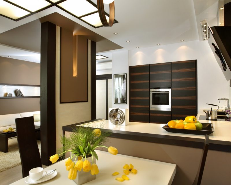 В качестве примера: если ваша кухня выполнена однотонным цветом, то предметы декора могут быть немного яркими, например добавить яркую оранжевую цветочную вазу, но если кухня исполнена в черно — белом цвете, то в такой интерьер не стоит добавлять ярких акцентов, потому что черно — белый цвет для нее уже считается ярким.