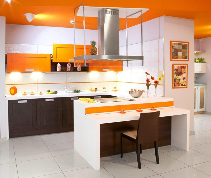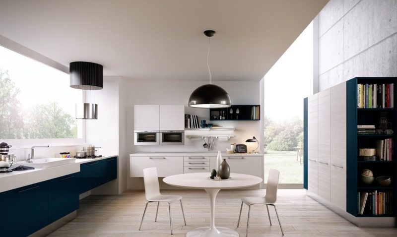 Освещение в модерновой кухне должно быть слегка рассеянным. Этого легко добиться, достаточно разместить по центру потолка одну люстру, а по остальному периметру установить точечные встроенные лампочки.