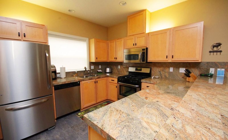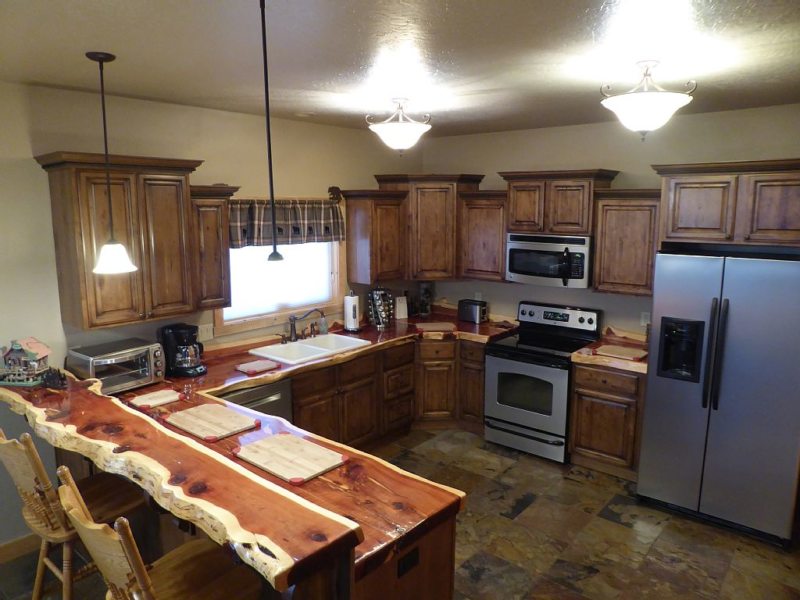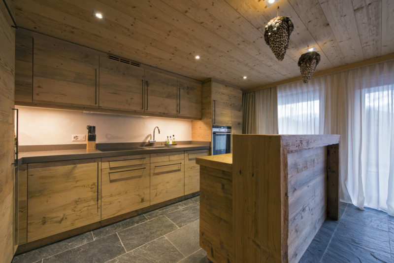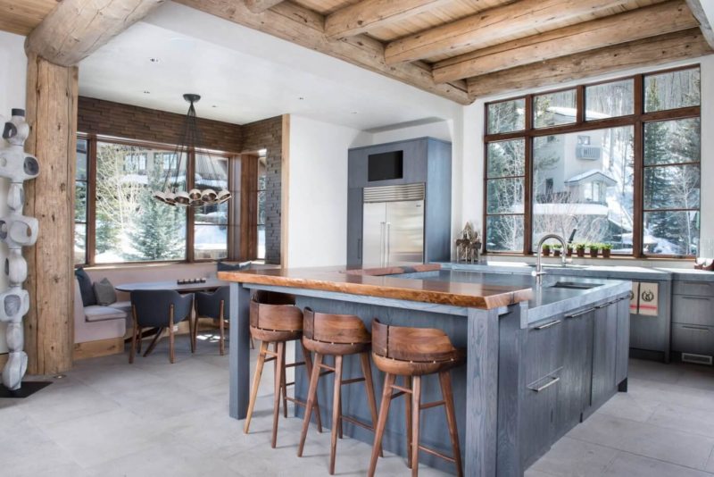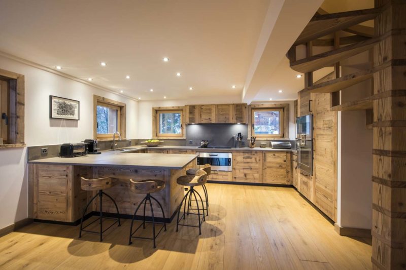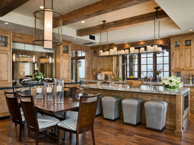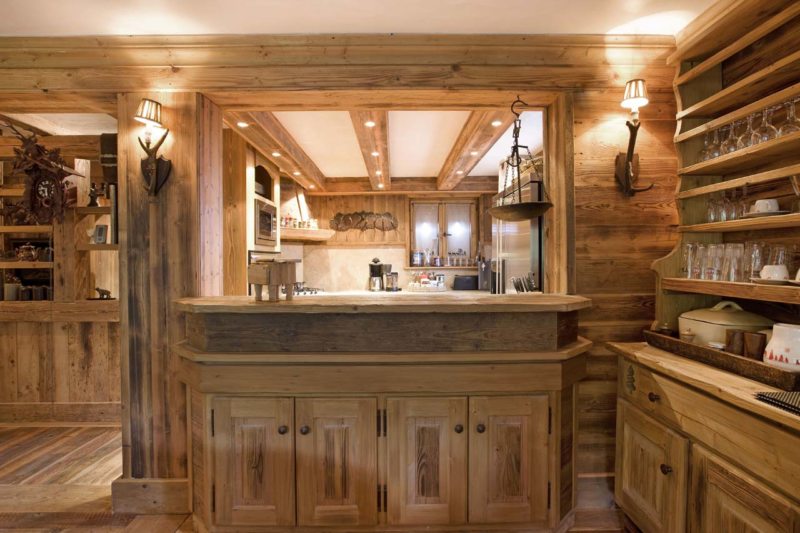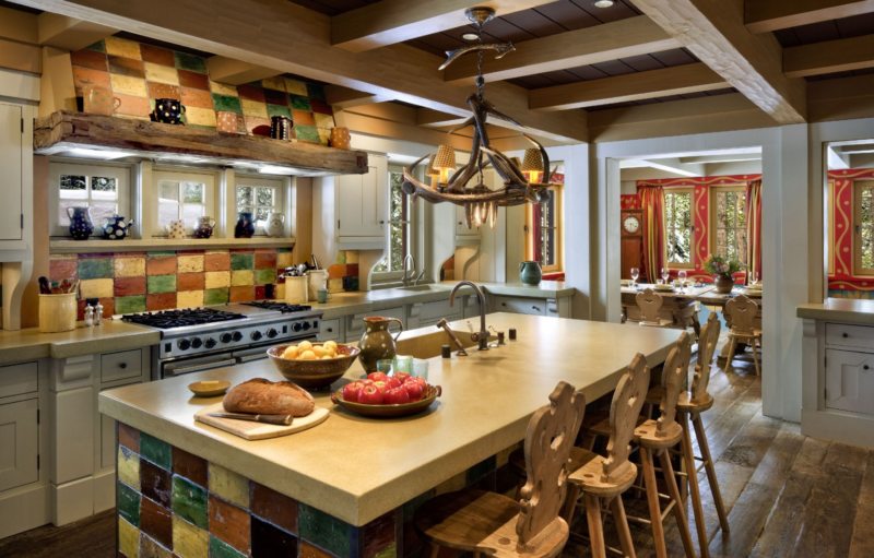 Стиль шале в интерьере кухни подчеркивается текстилем, что используется как для украшения, так и для утепления. Материи выбираются максимально плотные, шерстяные, полы украшаются войлоком, коврами. Сидения стульев дополняются накидками.