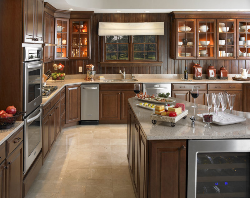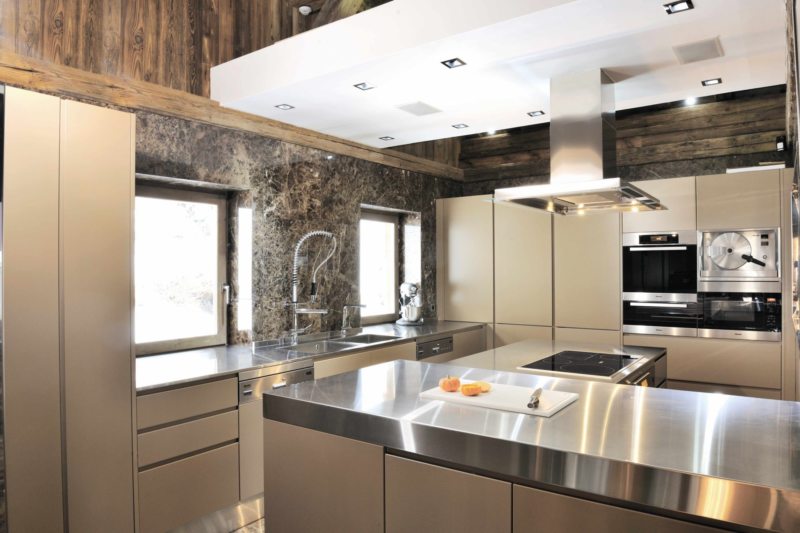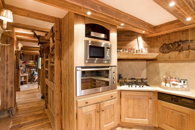 Надежность – девиз мебели, используемой на кухне шале. Оптимально, когда выполнена мебель с дерева темного цвета. Бюджетный вариант, МДФ мебель, с покрытием, что имитирует древесину.