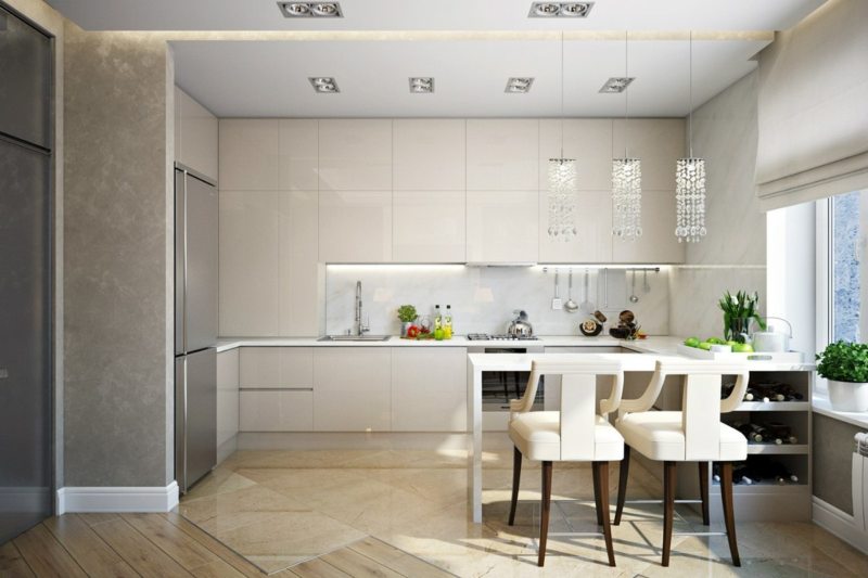 Гарнитур имеет полированные фасады, глянцевые фасады, без ручек и филенок. Уместно использование вставок, выполненных из матового стекла.