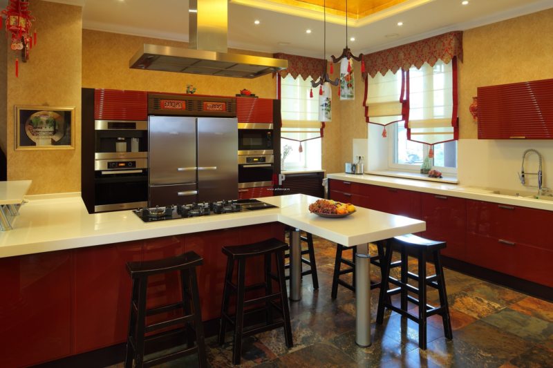 Если кухня просторная, то используется массивный обеденный стол. Каркас стола из дерева, металла или камня, а столешница основательная. Если же небольшая совсем кухня, то не стоит покупать крупную мебель, лучше выбирать более легкие металлические конструкции. На нескольких фото кухни в японском стиле прослеживается, что стулья тот предмет мебели, форма которого может быть обтекаемой.