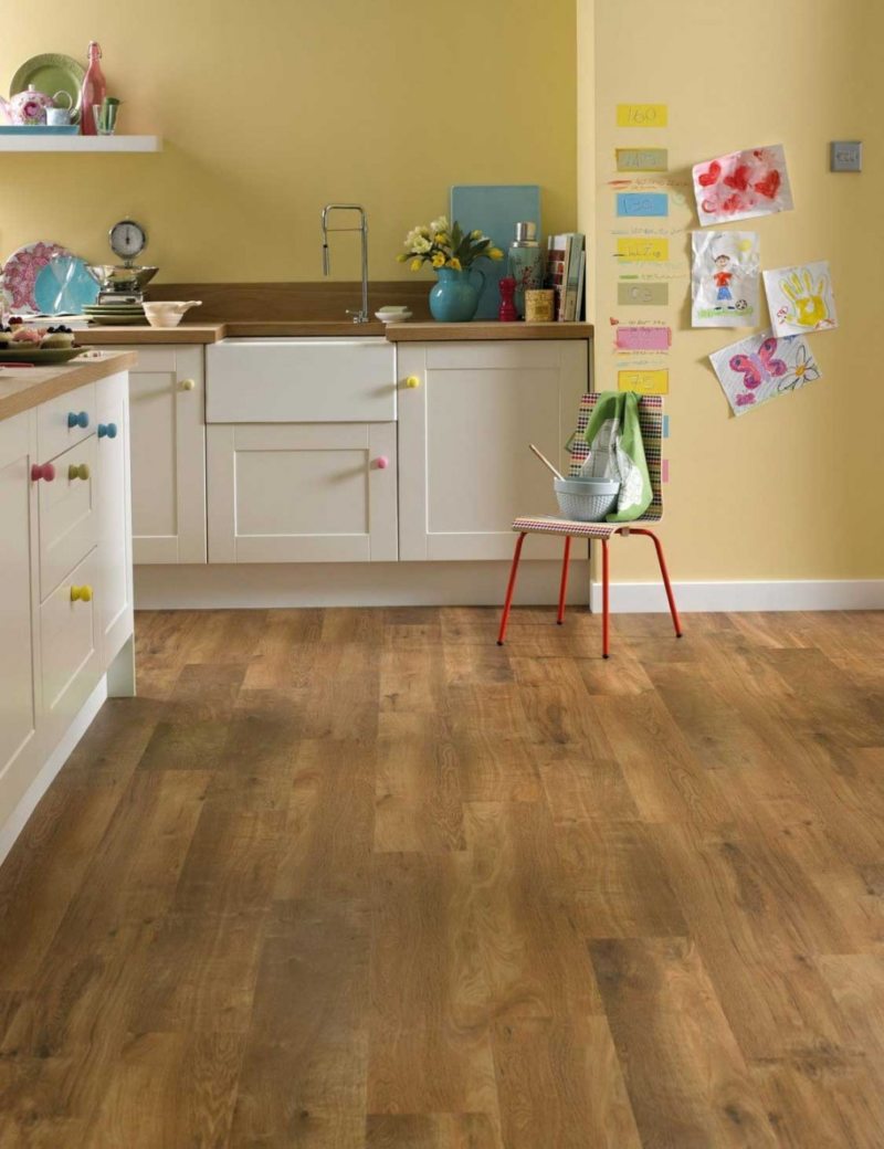 Он отлично противостоит бытовым воздействиям. На его поверхности не остается остатков жира и грязи. Ещё одним преимуществом такого линолеума является его теплоизоляционные свойства. В результате его сравнивают с натуральным пробковым покрытием. Все эти качества делают его лучшим линолеумом для кухни.