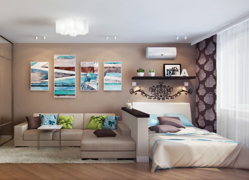 Необычно и неординарно будет смотреться помещение небольшой площади с диваном углового типа. Помните, что между меблировкой должно быть достаточно свободного места.