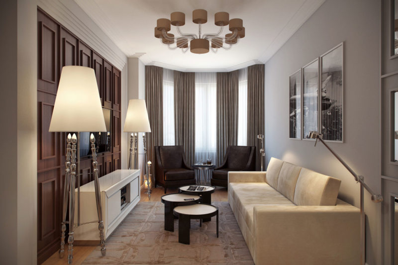 Немаловажно, чтобы помещение хорошо освещалось, особенно если речь о маленькой зале. Об аксессуарах тоже не нужно забывать.