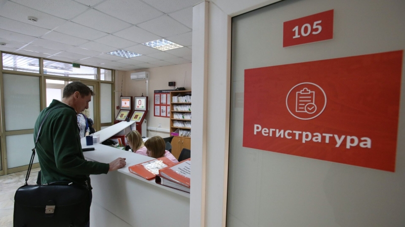 Посетитель у регистрационного стола в поликлинике. Архивное фото