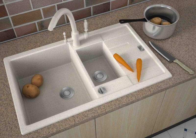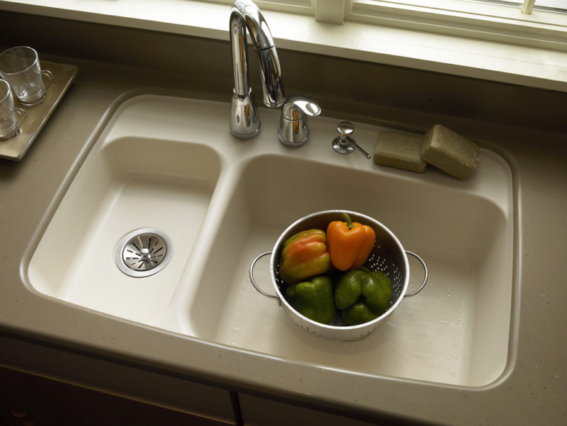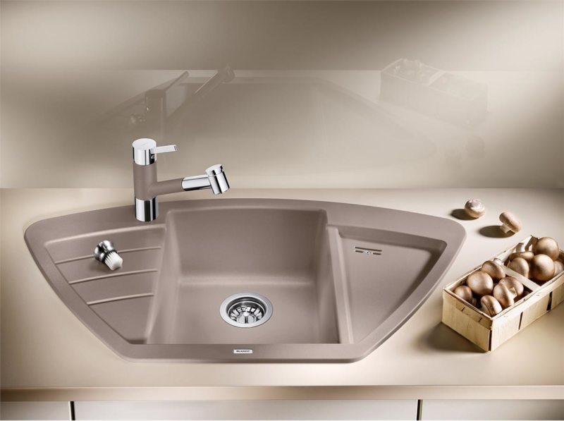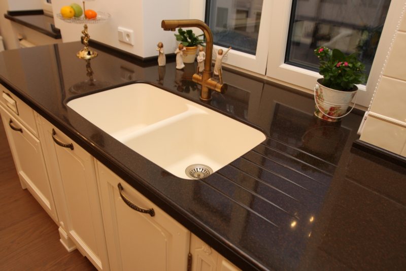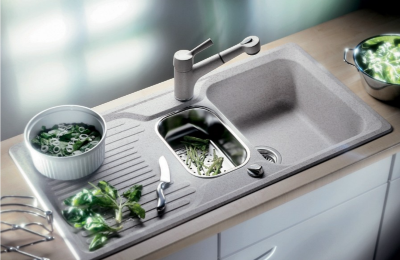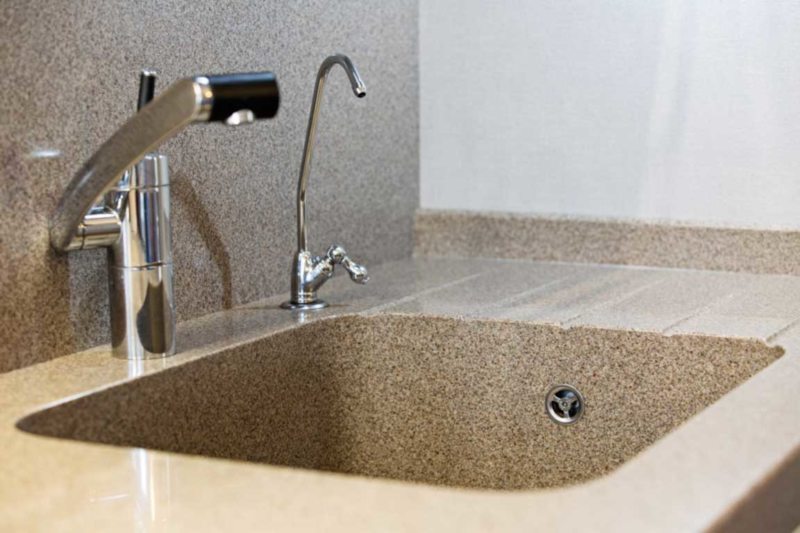 Мойки из искусственного камня экологичные и привлекательные внешне. Они просты в уходе, не страшатся химических влияний, приглушают шум от льющейся струи воды.