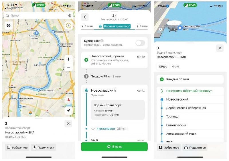Новый водный маршрут «Новоспасский» — «ЗИЛ» уже доступен в 2ГИС при построении маршрутов. Геосервис учитывает прогноз прибытия речного судна к причалу и прокладывает маршрут с учетом времени ожидания и реального времени прибытия в пункт назначения. Это удобно для речных маршрутов, которые в среднем ходят каждые 20 минут.
