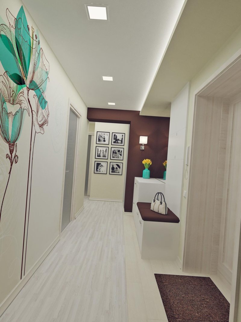 В данном случае рекомендуется воспользоваться яркими и светлыми цветовыми оттенками. Дело в том, что в помещении отсутствует большое количество естественного освещения из-за отсутствия окон, но оклеенные обои светлых оттенков придают помещению больше света.