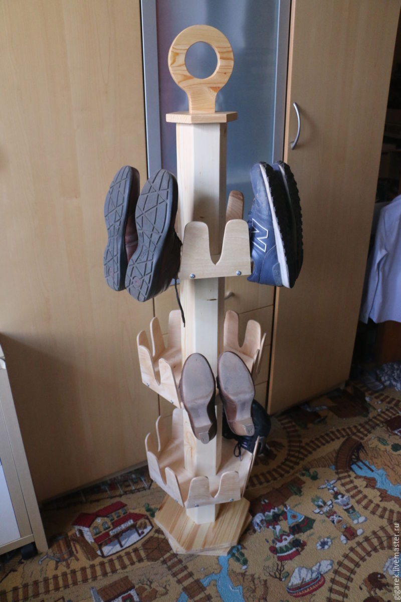 Маленькую прихожую может спасти крутящаяся обувница. Она не только сэкономит место, но и позволит вам хранить кучу обуви. Конструкция позволяет проветривать и сушить сразу все пары обуви. Но грязная обувь может располагаться лишь на нижней ступени.