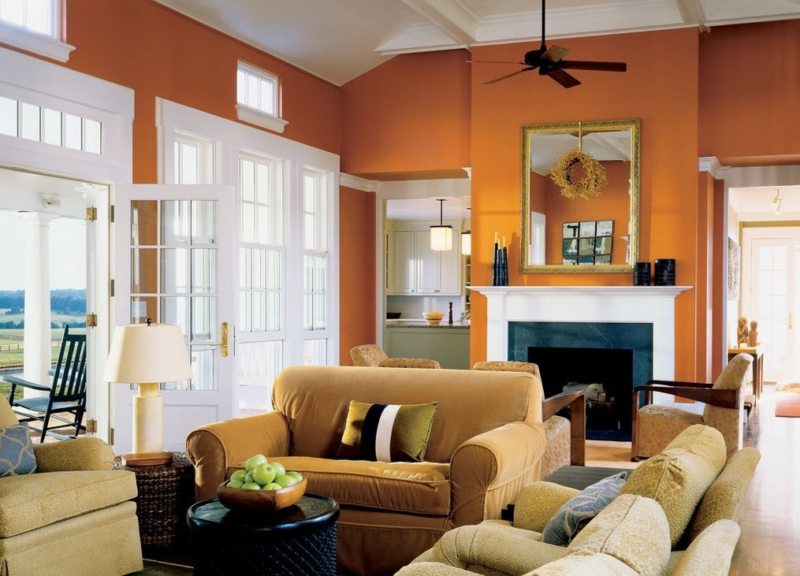 Для создания оранжевого дизайна в гостиной комнате профессионалы советуют выбрать один из следующих приемов: