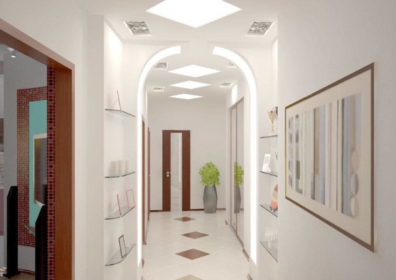 Освещение в узкой прихожей, которая может исполнять роль коридора, предполагает установки дополнительного светильника между комнатами.