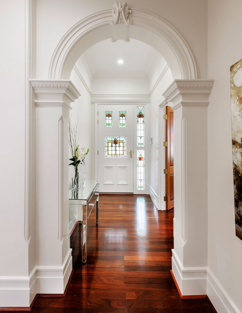 Для этого нужно разместить светильники у дверей. Чтобы сделать прохожу более просторной и светлой для комнат в доме, которые примыкают к этой части жилья, лучше выбрать стеклянные двери. Таким образом, натуральный и искусственный свет будет проникать в прихожую.