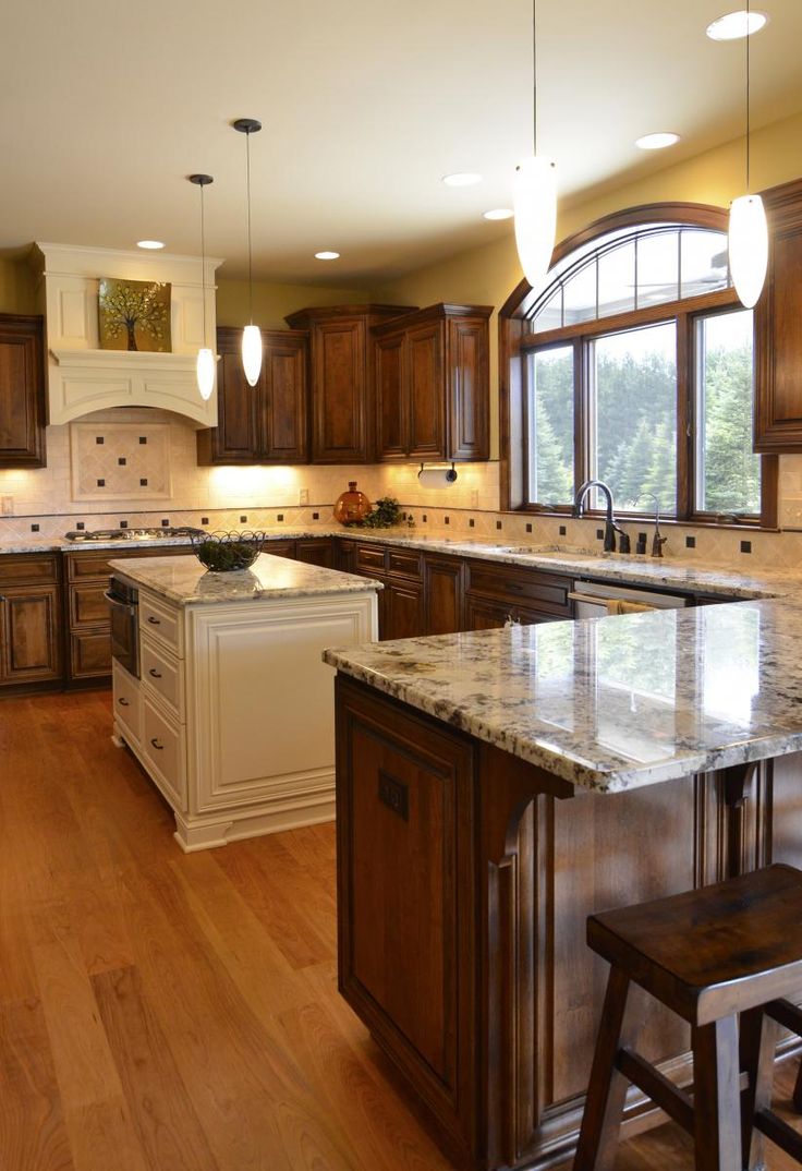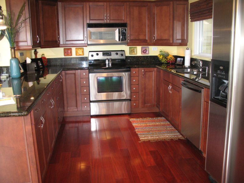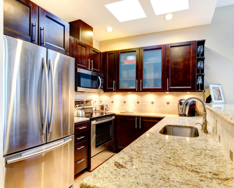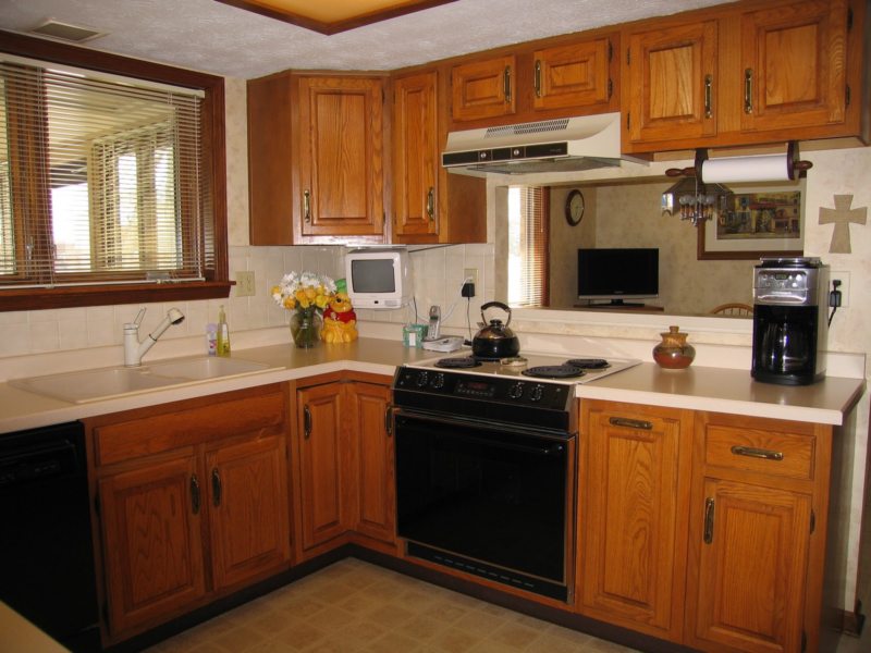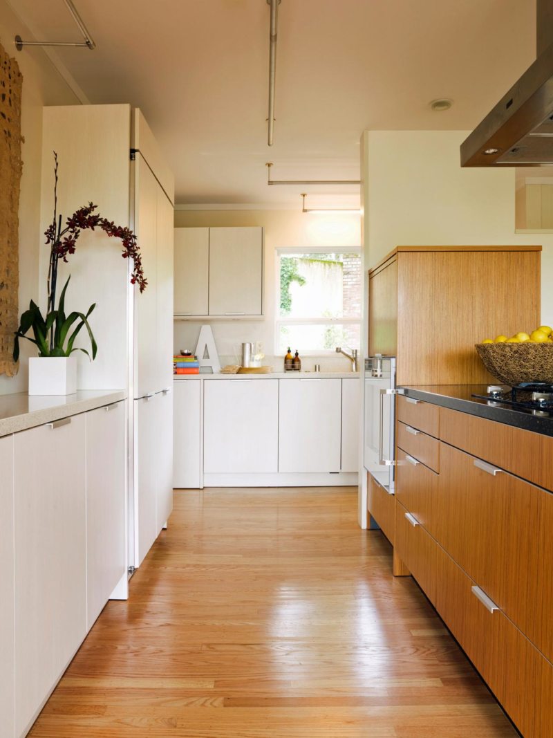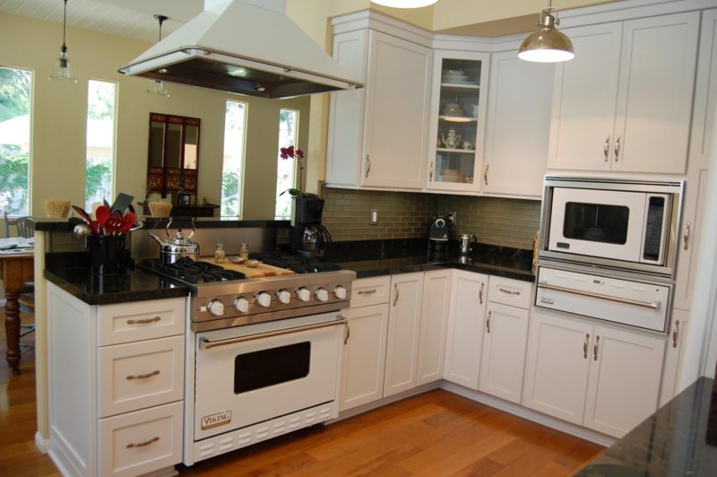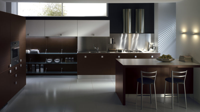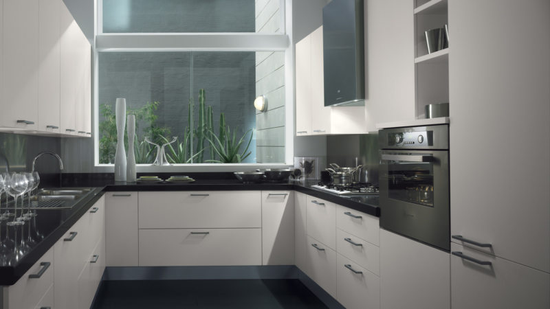 Однако, если правильно всё спланировать, то этот вариант может быть выбран и для небольшой кухни. Тут главное помнить, расстояние между противоположными шкафчиками лучше делать минимум полтора метра, иначе будет очень тесно.