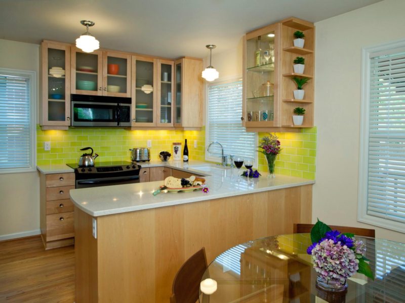 Большой популярностью пользуются фотообои. Отлично смотрится мозаика из мелких плиток. Если в кухне достаточно дневного света, прекрасно украсят помещение живые цветы или другие растения.