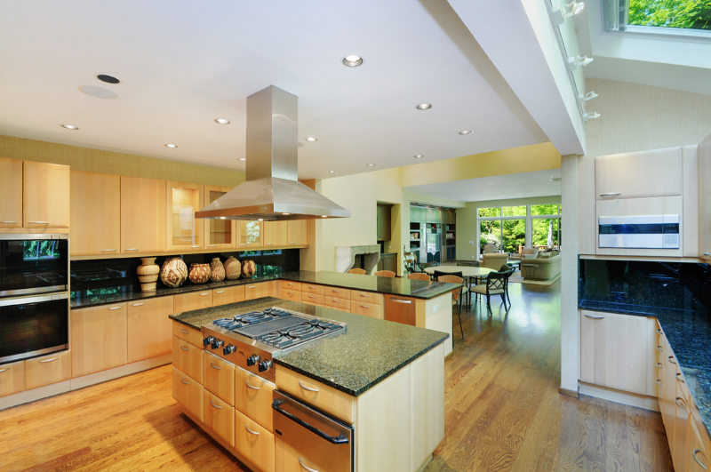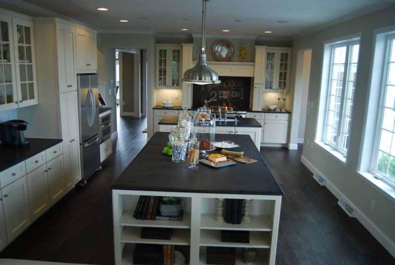 Если планируется установить кухонный остров, то центральный элемент ставится на расстоянии 1,2 метра, плита — 1,8 метра, а холодильник от 1,2 до 2,1 метра. Элементы на столешнице устанавливаются на расстоянии минимум 3 метра, чтобы рабочая поверхность была более удобной.