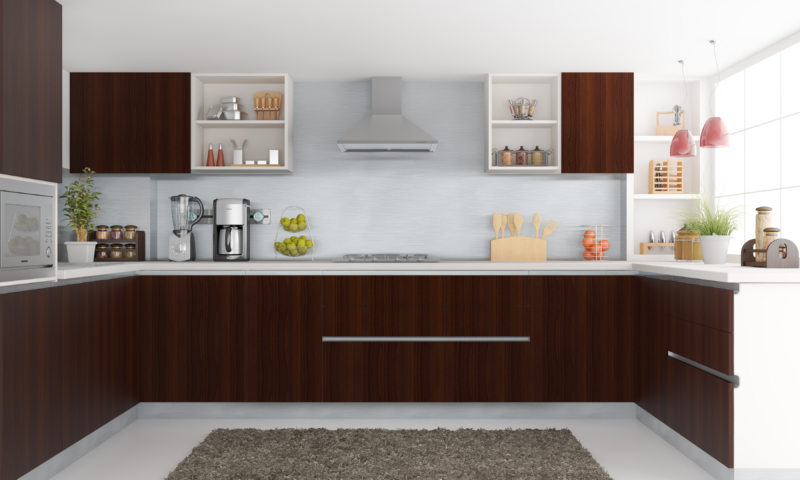 При планировании современного интерьера п-образной кухни важно продумать высоту и освещение рабочего места. А ящики следует выбрать такие, чтобы они выдвигались максимально.