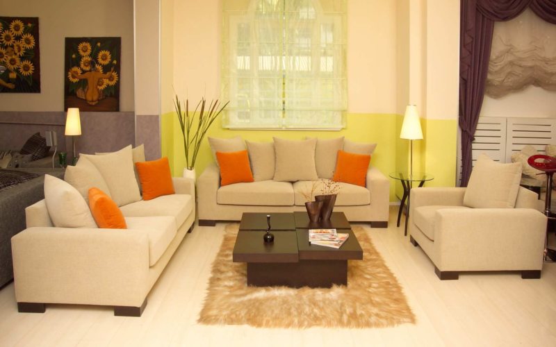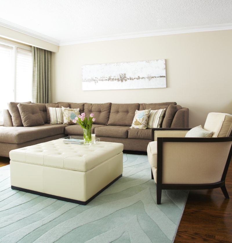Вместо них можно выбрать два или больше маленьких кресел. В планировку гостиной комнаты также можно добавить несколько ковров или шкаф.